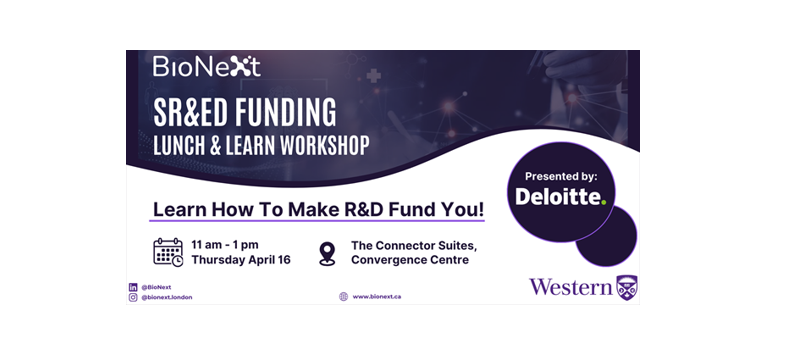 BioNext is pleased to announce an upcoming Lunch & Learn workshop focused on Scientific Research and Experimental Development (SR&ED) and other non‑dilutive funding strategies, led by Jennifer Edey and Brianne Potts, experts from Deloitte